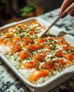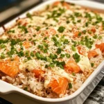 A warm, indulgent sushi-inspired casserole with tender salmon, creamy cheese, and seasoned rice, perfect for weeknight dinners.