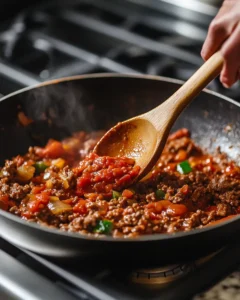 Add the ground beef to the skillet, breaking it up with a spoon or spatula as it cooks. Cook until the beef is fully browned with no pink remaining. Browning the meat properly is essential—it adds flavor through caramelization and gives the sauce a rich, hearty taste. Once the beef is browned, stir in tomato paste and cook for 1–2 minutes. Cooking the tomato paste before adding liquid helps to deepen its flavor, removing any raw taste and adding a subtle sweetness to the sauce.