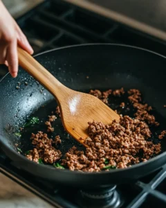 Add the ground beef to the skillet, spreading it out evenly. Use a wooden spoon or spatula to break the meat into small pieces as it cooks. Continue cooking for several minutes until the beef is fully browned and no longer pink. Browning the beef properly enhances its flavor and gives the bowl a rich, savory depth.