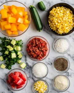 Add the diced bell peppers, zucchini, and corn to the skillet. Stir to combine, making sure the vegetables are evenly mixed with the beef. Cook for an additional 4–5 minutes, stirring occasionally, until the vegetables are tender but not mushy. The peppers should retain a slight crunch, the zucchini should be soft but firm, and the corn should add a touch of sweetness.