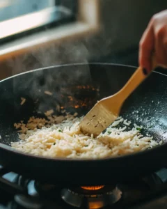 Heat olive oil, crisp the cooked rice for 3–4 minutes until golden.