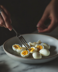 • Boil eggs for 10–12 minutes, then cool in ice bath and peel.